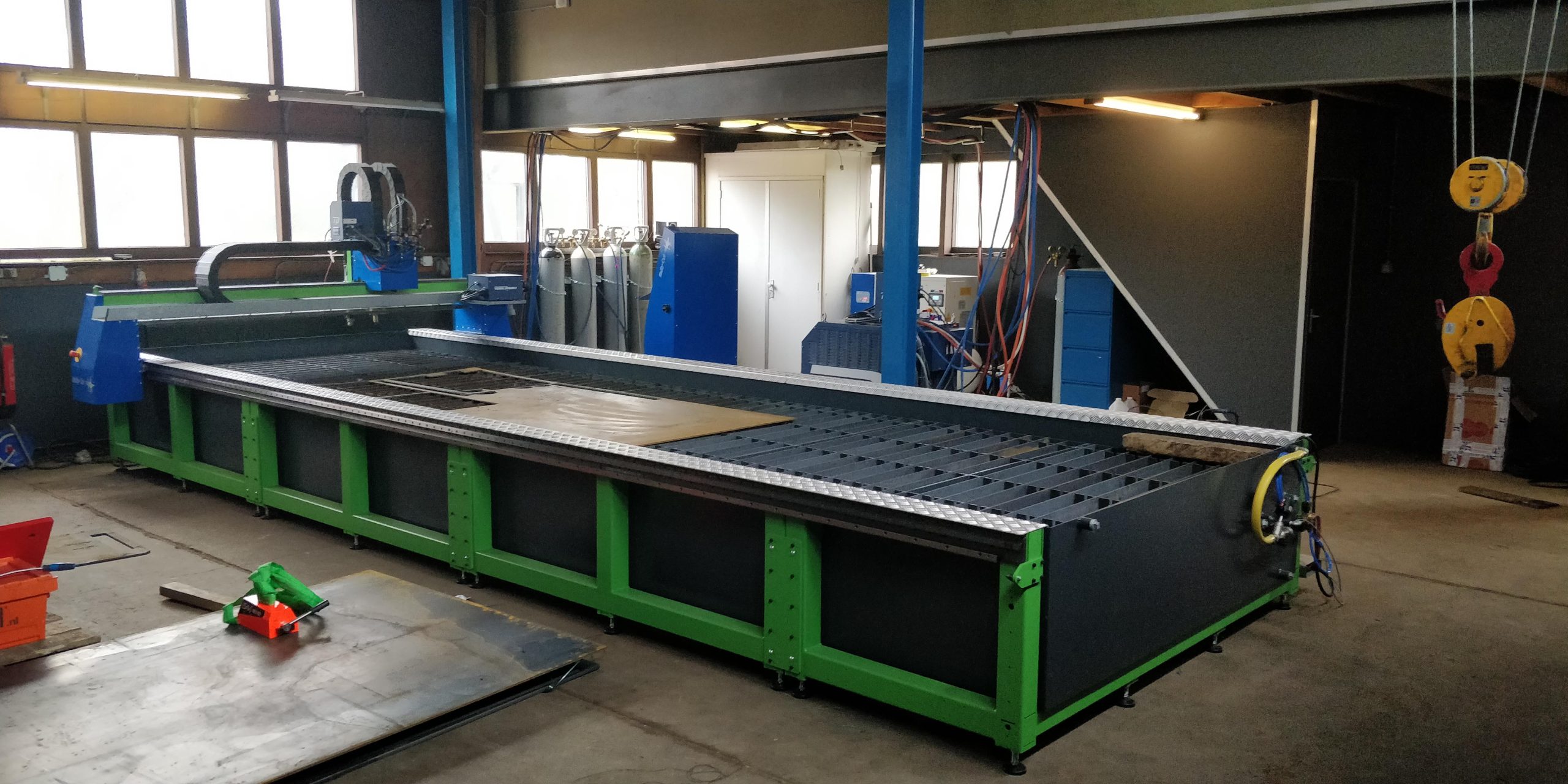 Al ruim een jaar zijn wij trotse eigenaar van een CNC-gestuurde snijtafel die d.m.v. plasma of autogeen plaatmateriaal in de gewenste vorm kan snijden. Met een snijoppervlak van 6000*2000mm kunnen wij platen van verschillend materiaal naar uw wens snijden. diktes tussen de 2mm en 60mm hebben wij standaard op voorraad liggen. De maximale dikte die gesneden kan worden is 200mm dik. ook kunnen wij de machine verstellen zodat er onder een hoek een laskant aangebracht kan worden.